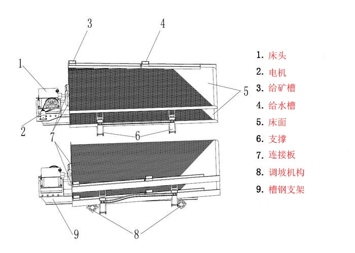 2,能耗小:双层摇床比两台单层摇床功率还小0.7KW,有效降低选矿厂能耗方面的成本。