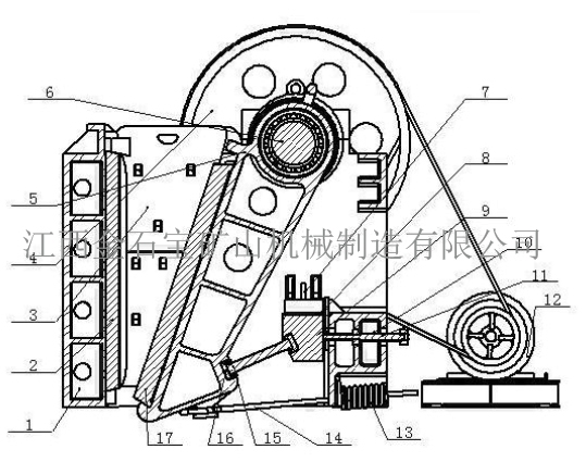 10.拉紧螺栓 11.顶杆螺栓 12.电动机 13.弹簧 14拉杆 15.肘板 16.肘板垫 17.活动鄂板