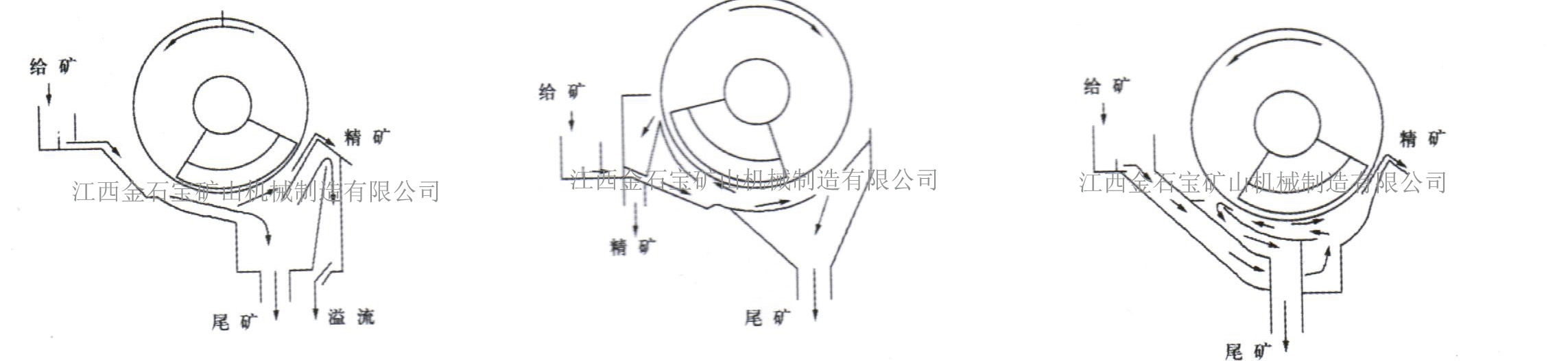 同一圆筒可配三种槽体,即顺流槽(CTS)、逆流槽(CTN)和半逆流槽(CTB),以适应不同的选别要求。