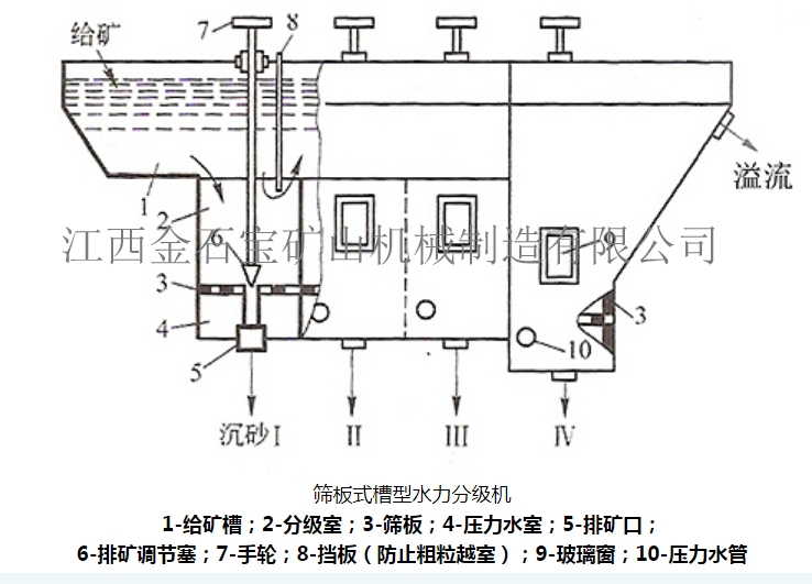 矿浆由一侧给入,依次进到各室中,各室的上升水速逐渐减小,由此得到由粗到细的各级产物。分级室内上升水速分布是否均匀对分级效果有重要影响。减小筛孔并相应增加筛孔数目可在一定程度上改善效果。但水速分布不均是难免的。由此引起二次回流搅动效率不高的重要原因。