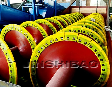 洗砂机转子采用中心结构,螺旋叶片安装在中心轴上;电机带动减速机,减速机联动中心轴。借助固体颗粒的比重不同,因而